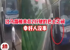 过马路时被夹在2行驶的巴士之间 幸好人没事