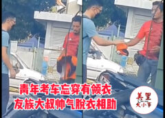 【#大马事】 #青年考车 #忘穿有领衣 #被拒进考场 近日许多网民分享一部短片,短片的内容是一青年因忘穿有领衣服,被拒绝进入考场,而在一旁的大叔知情后,直接脱下自己的衣服借给青年,…