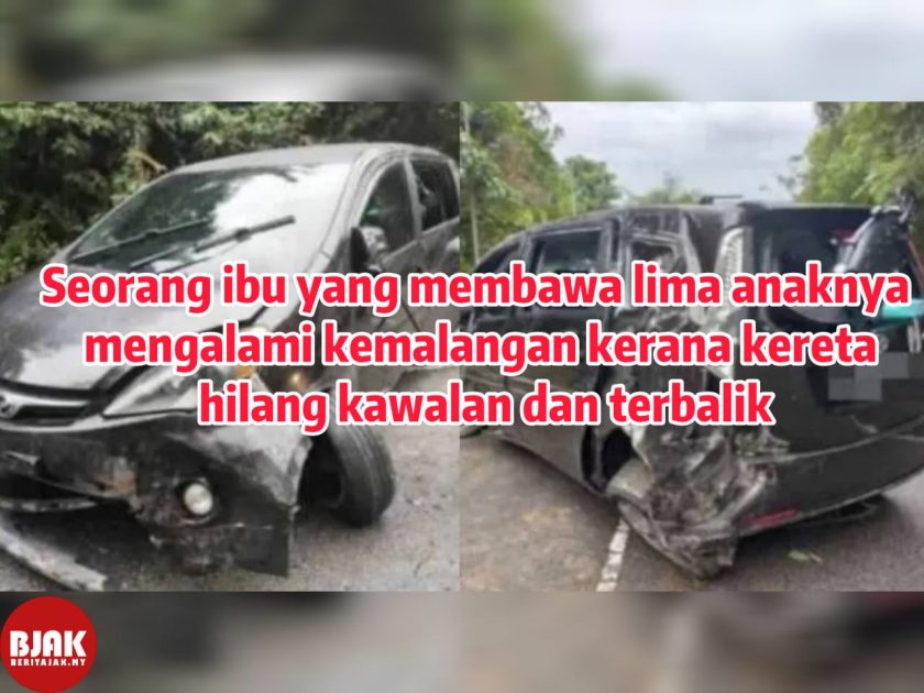 Seorang Ibu yang Membawa Lima Anaknya Mengalami Kemalangan kerana Kereta Hilang Kawalan dan Terbalik