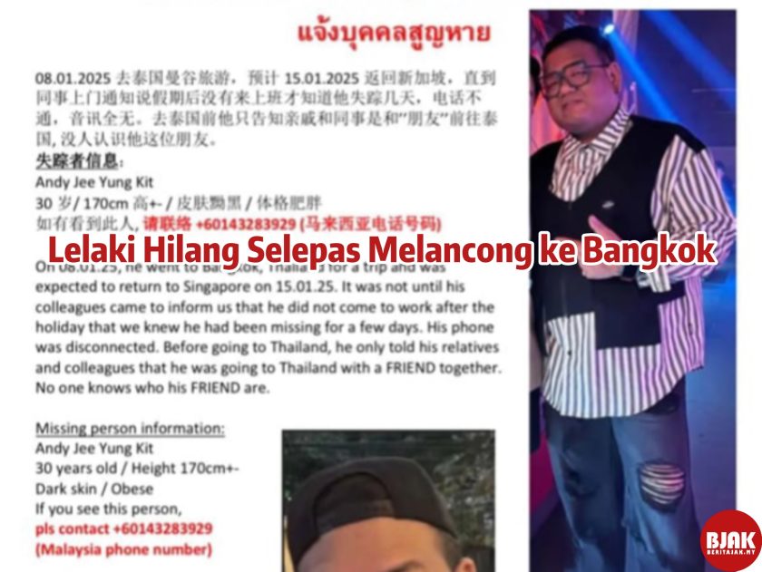 Lelaki warganegara Malaysia, Andy Jee Yung Kit (30 tahun), dilaporkan hilang selepas melancong ke Bangkok, Thailand, bersama rakan pada 8 Januari. Dia sepatutnya kembali ke Singapura untuk bekerja pada 15 Januari tetapi tidak muncul, dan keluarga serta rakan sekerja gagal menghubunginya. Dia mempunyai ketinggian kira-kira 170 cm, berbadan gempal, dan berkulit gelap. Keluarga merancang untuk membuat laporan polis di Thailand dan memulakan pencarian. Mereka memohon bantuan orang awam untuk memberikan maklumat melalui nombor telefon: +60143283929.