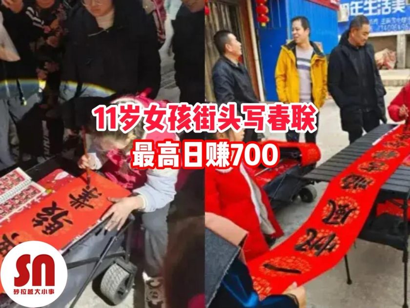 11岁女孩街头写春联 最高日赚700 2025年1月27日2025年1月27日 co编 【#国际事】 #街头 #春联 四川一名11岁女孩因在街头写春联,引起网民关注。她利用事先准备好的模版,几分钟内就可写好一副春联。一天收入最高可达到700人民币(约421令吉)。 #行行出状元 #有个手艺挺好 Post Views: 143