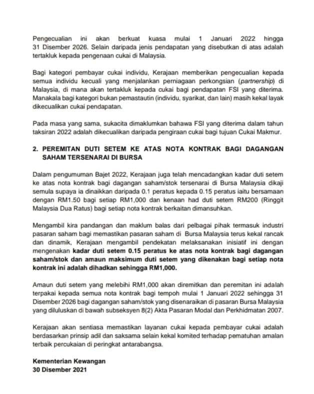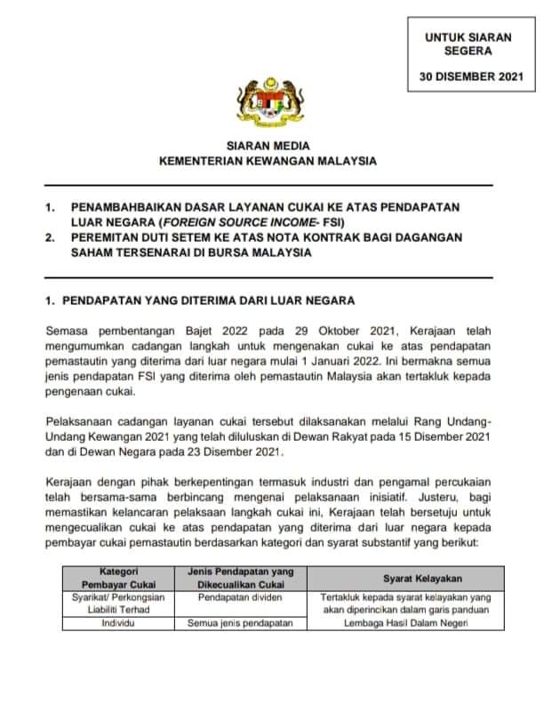 财政部宣布,政府已同意从2022年1月1日至2026年12月31日期间,豁免向包括公司,有限公司和个人在内的纳税人,征收特定境外收入税务。