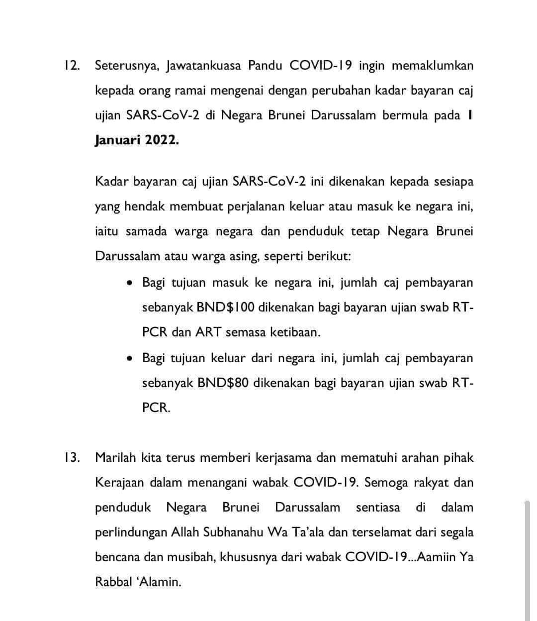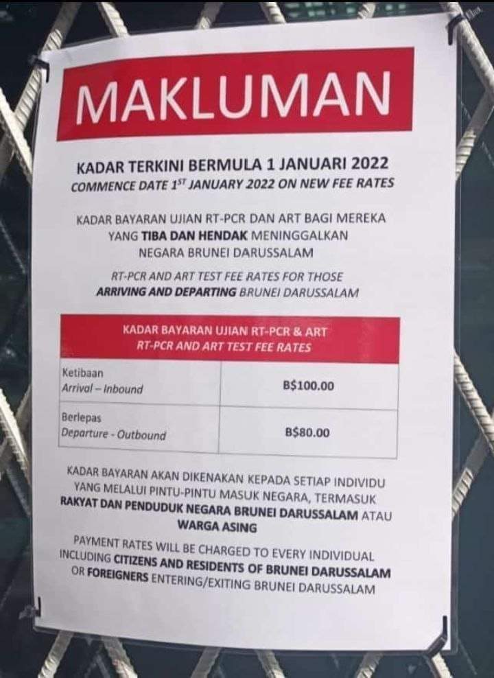 根据汶莱政府的规定,从2022年1月1日起,任何需要入境及出境汶莱的民众,包括汶莱公民或永久居民,以及外国人,一律都需要付费进行新冠肺炎检测。