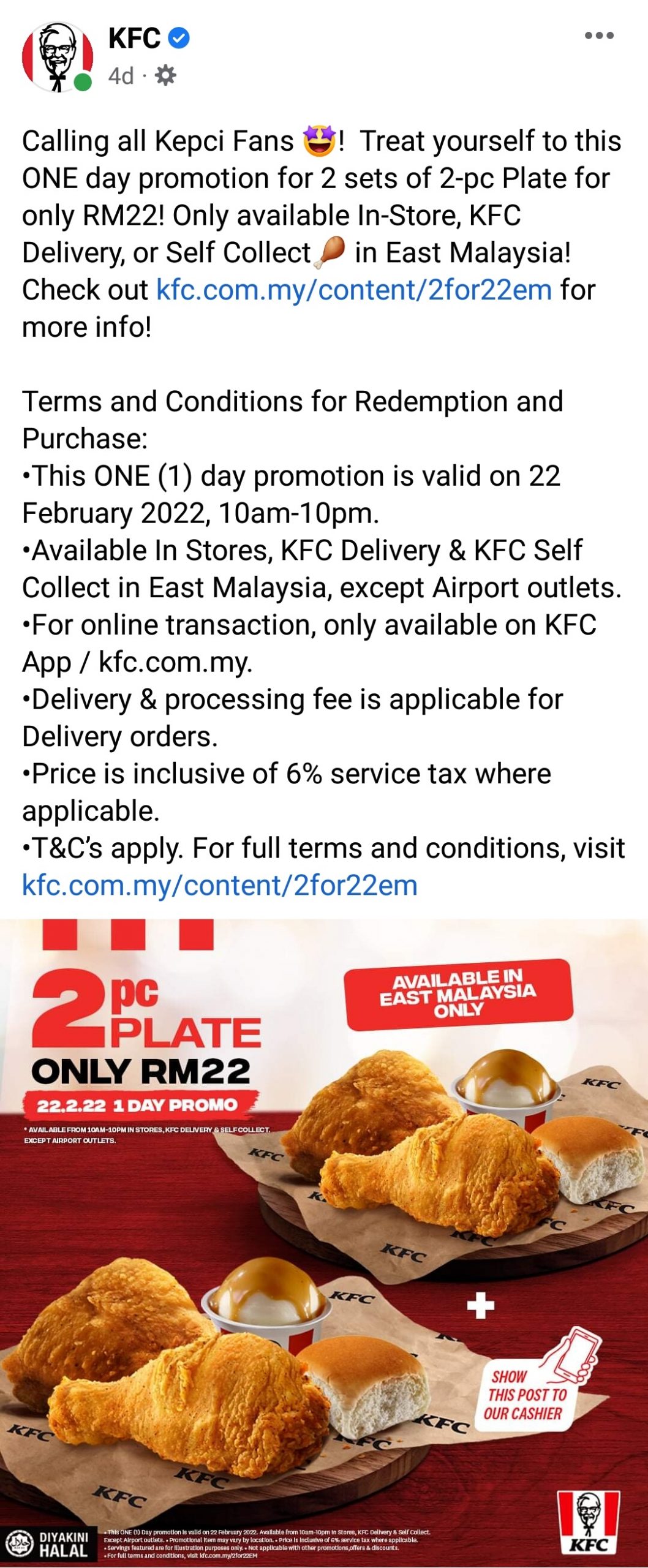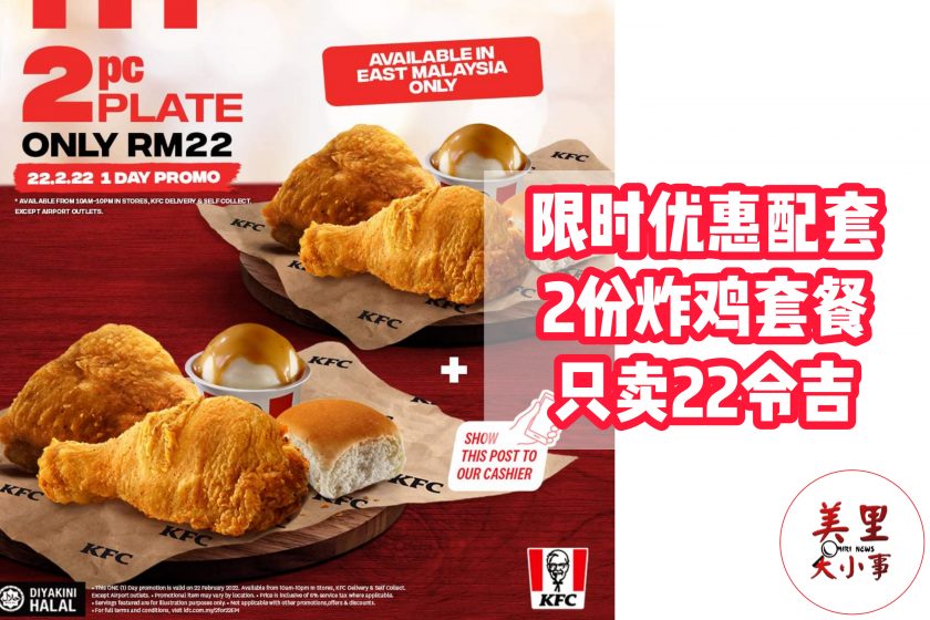 KFC 限时优惠22令吉套餐 2022年2月22日2022年2月22日 H编 【#大马事】#东马事 #KFC #限时优惠 #2份炸鸡淘重庆 #只卖22令吉 今天是2022年2月22日星期二,你今天饿了吗?KFC在东马的分行将有22令吉2盘2块的炸鸡套餐在今日限时优惠推出,喜欢吃KFC的朋友不要错过了。 📷图片来源 Credit : KFC脸书专页 #小编就决定今晚晚餐吃KFC好了 Post Views: 85