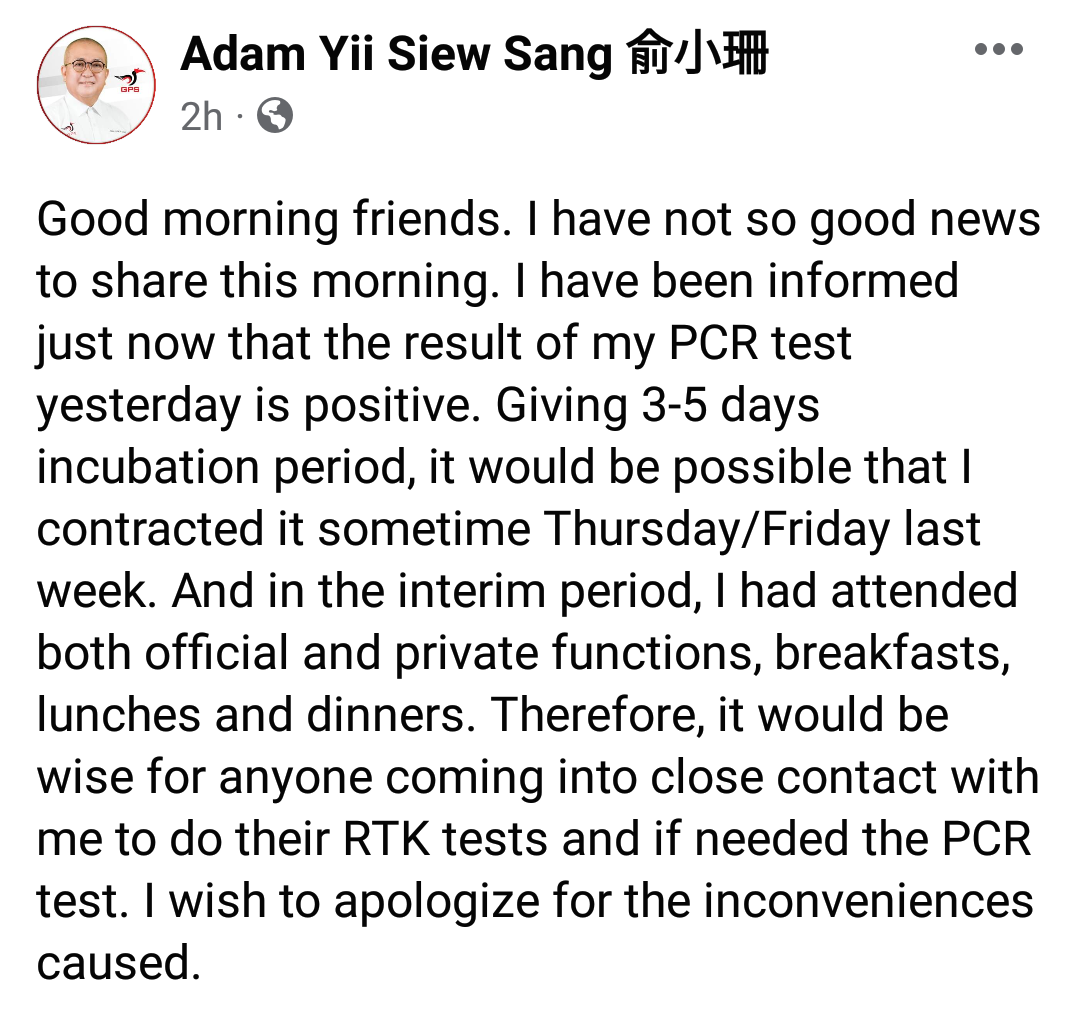 美里市长确诊 2022年3月10日2022年3月10日 H编 【#美里事】#美里市长 #确诊 美里市长兼埔奕区州议员俞小珊今日在个人脸书专页发表帖文,表示自己确诊新冠肺炎。 他表示是今早接获PCR检测报告指出确诊。他估计自己是在上周四或周五感染,并且已经通知所有与他有近距离接触者需要进行自我隔离及检测。对于所造成的不便他表示遗憾。 他在帖文里表示过去两天他感到不舒服,有一点咳嗽,没有头疼或肌肉疼,胃口正常。 📷 美里市长脸书专页 Post Views: 92