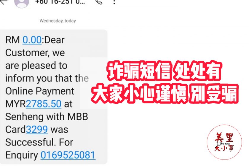 诈骗短信 层出不穷 大家谨慎 避免受骗 2022年3月24日2022年3月24日 L编 【#大马事】#诈骗短信 #处处有 #大家小心谨慎 #别受骗 近来的诈骗短信越来越多,也层出不穷。小编的家人,同事和友人都有收到类似的短信。短信内容说明你用了信用卡在哪里消费,预知更多详情请点击链接或者拨指定电话等。 小编呼吁大家要小心谨慎避免受骗。如果真的不放心可以亲自到银行查办或联系正规的银行客服联络号码。 Post Views: 98