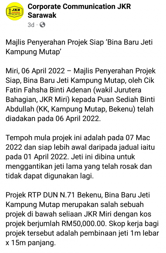 造价5万 网民疯狂吐槽新码头工程 2022年4月11日2022年4月11日 L编 【#美里事】#码头 #造价 #5万令吉 #网民疯狂吐槽 美里工程局日前公布一段图文,表示刚完成一项位于Bekenu村庄的码头工程。该帖文遭网民疯狂吐槽,原因是一段小小的木制码头居然要花费5万令吉。 有网民表示是不是4万5千令吉放入口袋,5千令吉是实际工程费用。还有很多人留言表示只是买贵了。 #你觉得呢? Post Views: 79