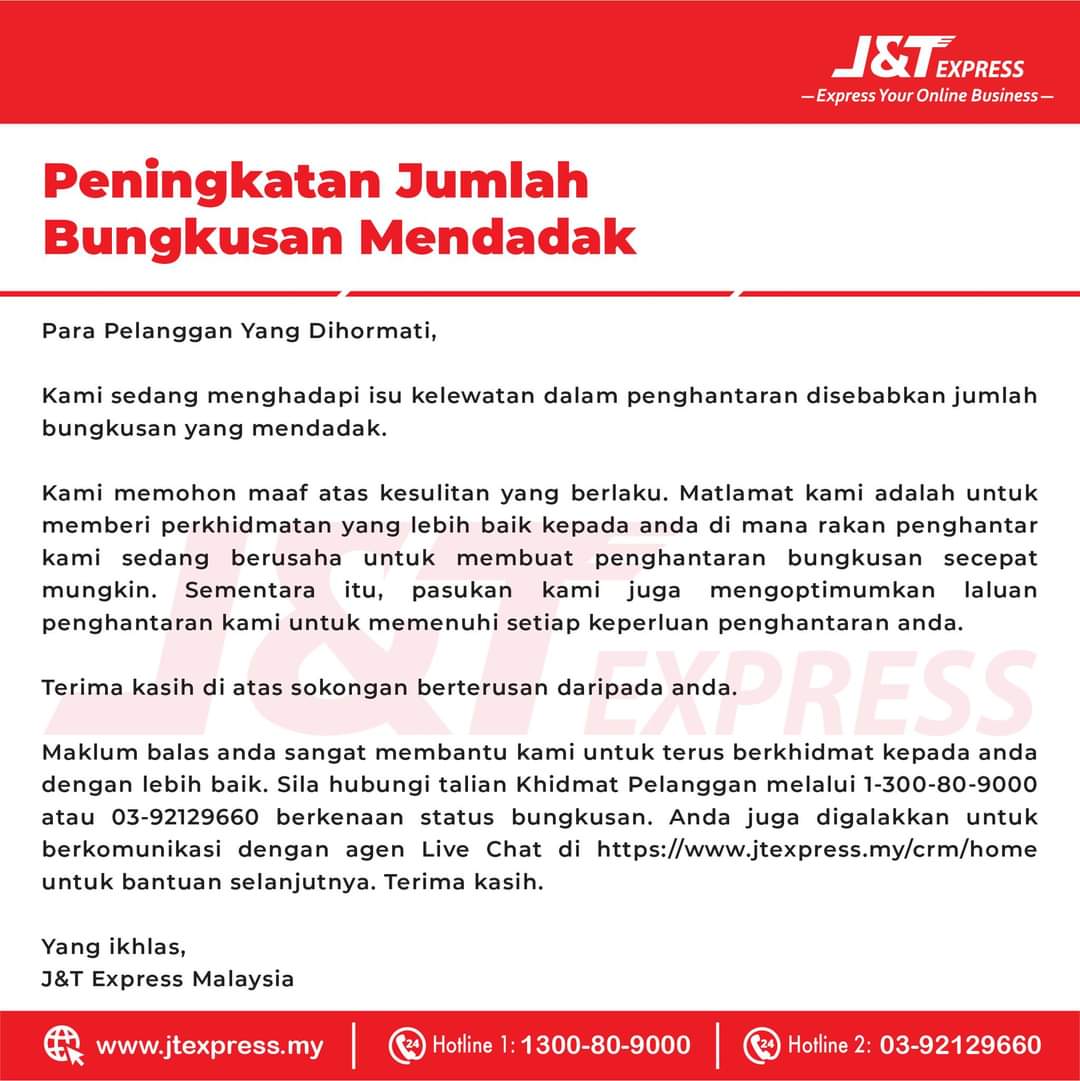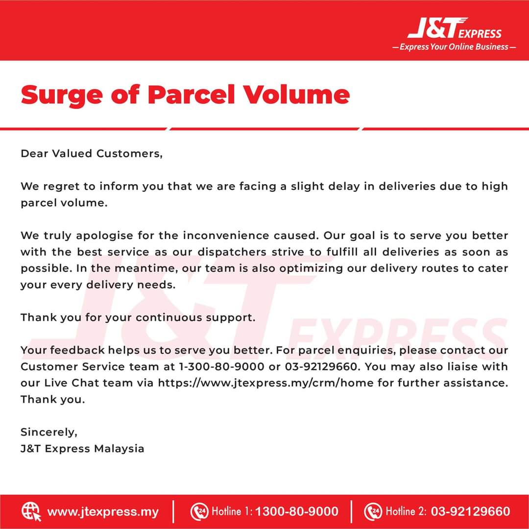 比较慢处理包裹发放 J&T表示抱歉 2022年5月19日2022年5月19日 H编 【#大马事】#J&T #慢发放包裹 #表示抱歉 你的包裹收到了吗? J&T发布文告表示佳节期间订单及包裹激增,对于比较慢处理包裹表示抱歉。 #你接受的到吗? Post Views: 98