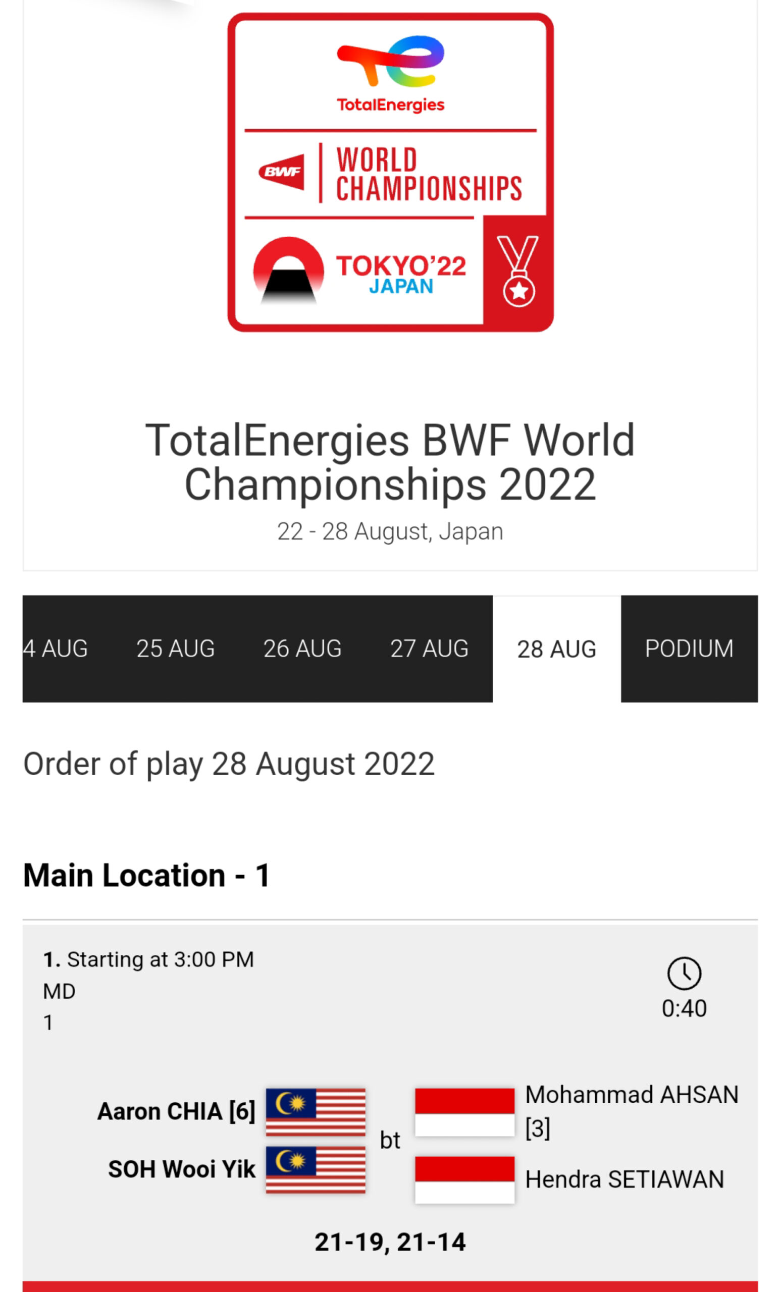 大马男双勇夺世锦冠军 2022年8月28日2022年8月28日 藤编 【#体育事】#大马男双 #世界羽球锦标赛 #夺冠 大马男双谢定峰与苏伟译在2022东京世界羽球锦标赛男双决赛中,以21比19、21比14,直落两局战胜印尼名将莫哈末阿山和亨德拉,首夺世界冠军! 📷 Badminton Association of Malaysia – BAM 官网截图 >> #恭喜 #大马之光 #明天有放假吗?🤣 Post Views: 97