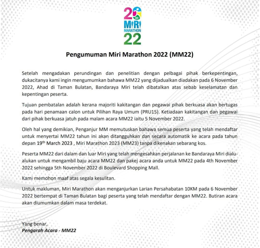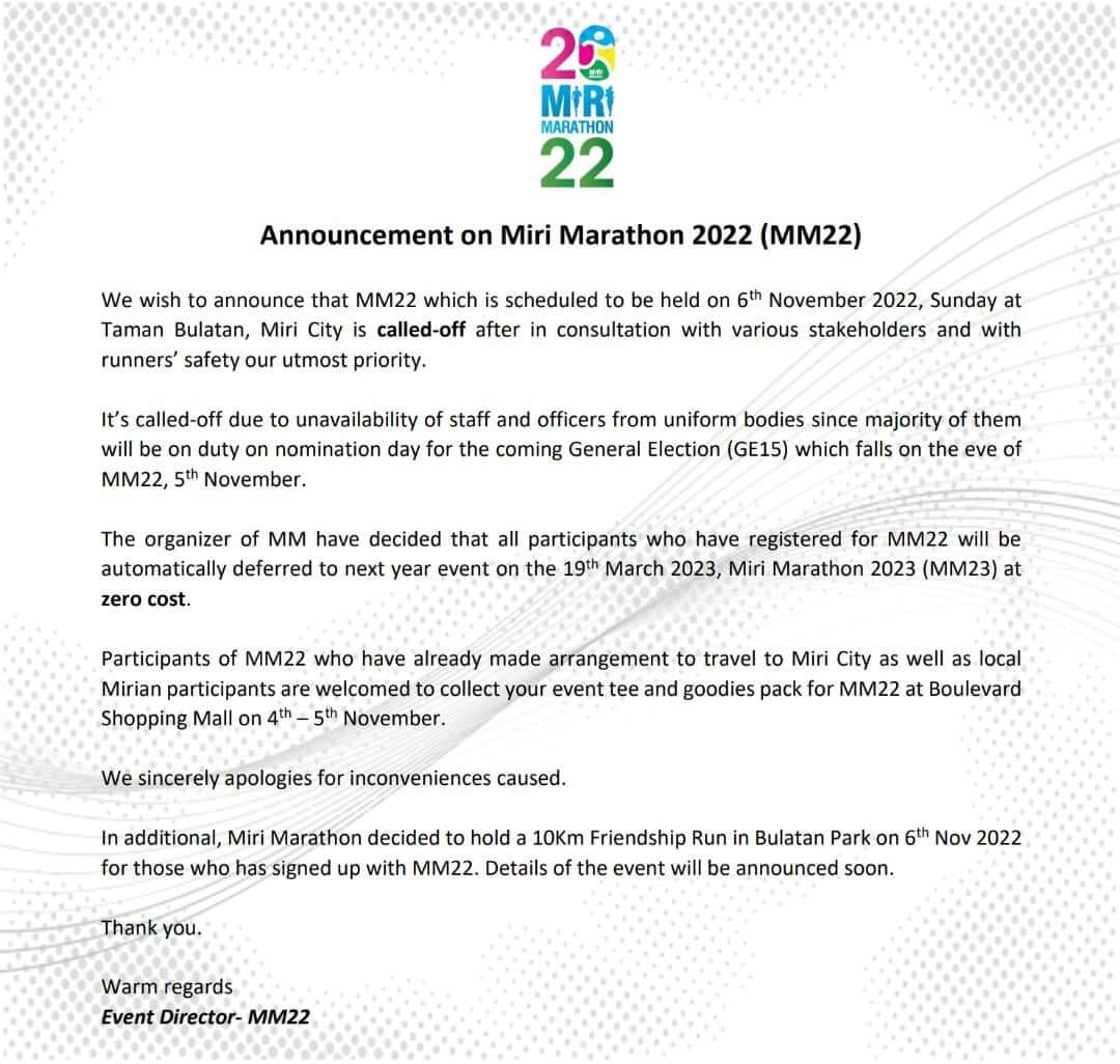 美里马拉松赛展延 报名者大吐苦水 2022年10月28日2022年10月28日 L编 【#美里事】#美里马拉松赛展延 #报名者 #大吐苦水 #表示不满 原定于11月6日在美里人造湖公园举行的2022美里马拉松赛宣告展延。 根据主办方给出的文告表示比赛展延的原因是因为大部分支援活动的制服单位在11月5日有参与全国大选提名日的工作,因此这些单位无法派出足够人手来支援马拉松比赛。 报名者不解的是为何这么迟才突然宣布展延,对于那些外地到来的参与者更是不公平,因为他们已经缴付及安排住宿与交通。而且提名日及马拉松赛根本不在同一天,如此的理由实在让人难以接受。 Post Views: 120