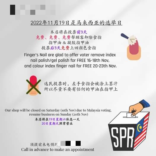 鼓励投票 美甲店 免费为顾客 卸涂指甲油 2022年11月11日2022年11月11日 L编 【#大马事】#鼓励投票 #美甲店 #免费帮顾客 #卸涂指甲油 位于雪兰莪州巴生的一间美甲店于11月7日(周一)在其脸书专页宣布,该店将于投票日的前三天(11月16日、11月17日和11月18日),免费帮忙顾客卸除食指上的指甲油和凝胶指甲油,以让他们能履行公民责任。 “在投票日后三天(11月20日、11月21日、11月23日),该店会免费帮忙之前上门卸除指甲油的顾客上回颜色。 #真是佛心的美甲店#不知道美里的美甲店有没有愿意提供服务的#第15届全国大选 #小编也鼓励你投票 Post Views: 193