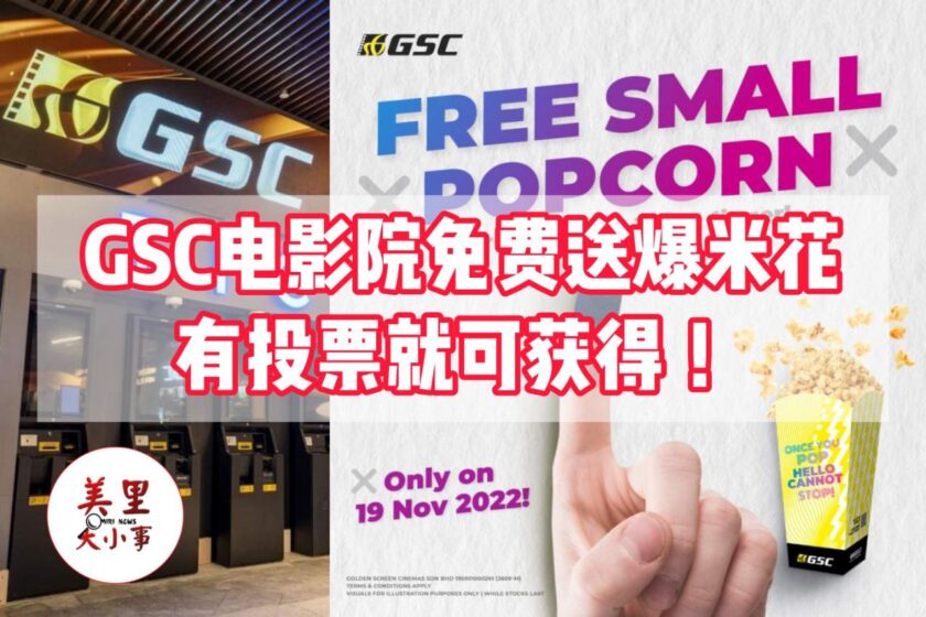 GSC电影院免费送爆米花 无需购买戏票 2022年11月15日2022年11月15日 小小编 【#大马事】 #只需秀出投票后 #染墨的手指 #就可获得 #爆米花 根据GSC连锁电影院所发出的消息,民众在11月19日投票后可前往GSC领取免费的爆米花,民众无需进行任何消费,只需出示染墨的手指,就可领取免费的小包装的爆米花(Small Popcorn)。此优惠只限2022年11月19日,适用于全马所有GSC分店,除了Aurum Theatre。 #爆米花有限 #先到先得 #第15届全国大选 Post Views: 196