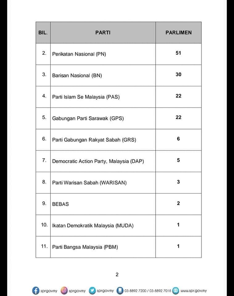 悬持国会 各政党联盟协商组联合政府 2022年11月20日2022年11月20日 H编 【#大马事】#第15届全国大选 #悬持国会 #各政党协商组政府 根据目前已经揭晓的第15届全国大选成绩,220个已经揭晓的席位中,成绩如下希盟有82席国盟73席国阵30席GPS砂拉越政盟 22席GRS沙巴政盟 6席民兴党 3席独立人士 2席社会民主和谐党KDM 1席 国家最高元首已经谕令,赢得多数议席的政党或政治联盟党魁在周一11月21日下午2点,之前,提名首相人选。 国家皇宫发布的文告指出,没有任何政党或政治联盟赢得简单多数的国会议席来组成新政府。 Post Views: 104