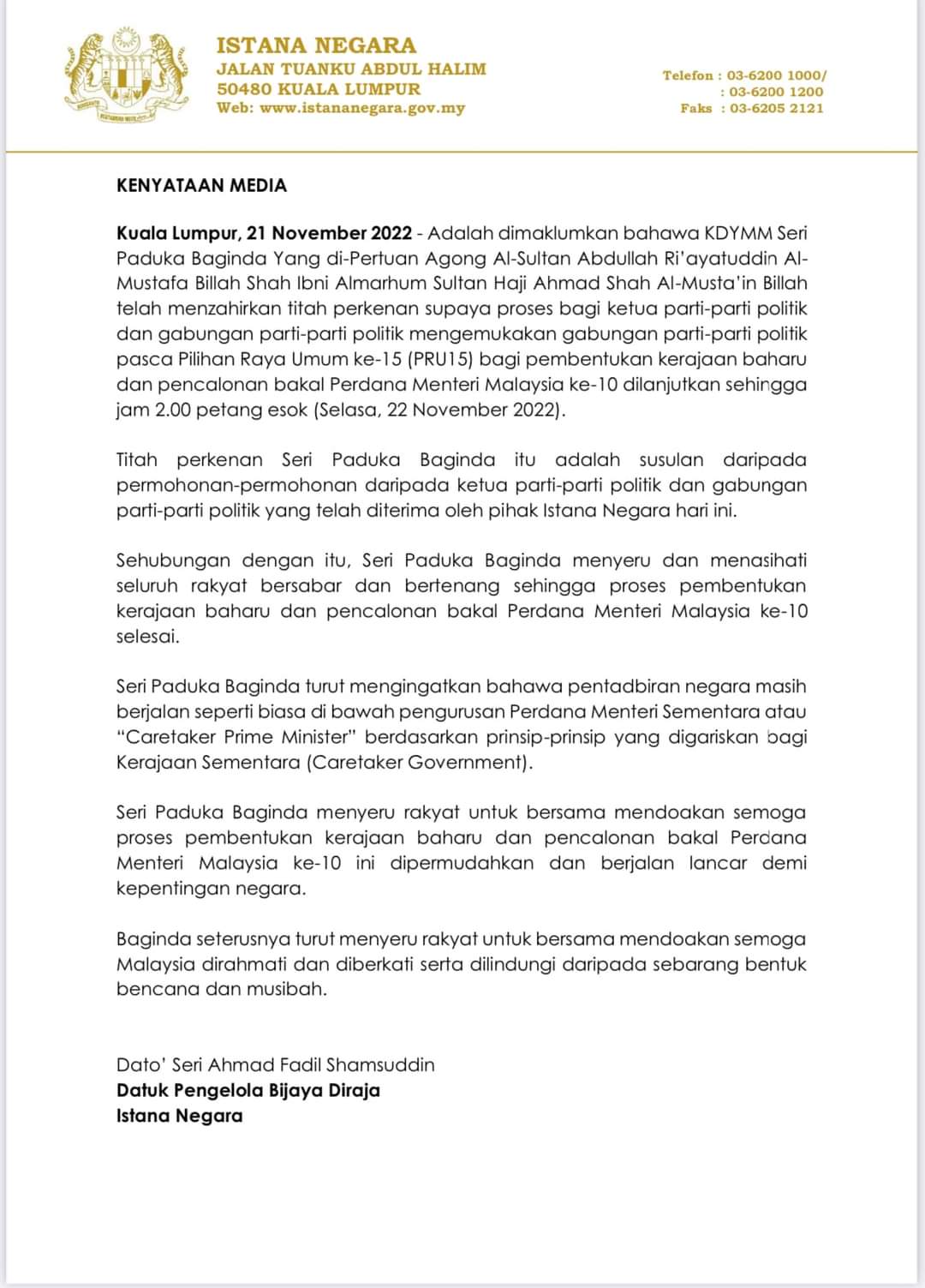 谁是第10任大马首相 明天才揭晓 2022年11月21日2022年11月21日 L编 【#大马事】#第15届全国大选 #谁是第10位大马首相 #明天11月22日揭晓 国家最高元首发布最新谕令,同意延长各政党或政治联盟党魁的首相人选提名,至11月22日下午(星期二)2点。 国家皇宫发布的文告指出,最高元首吁请人民耐心等待,并表示政府部门在看守首相的管理下如常运作。陛下也请所有人民共同祈祷,让新联合政府顺利成立。 各大政党目前在协商 希望很快就有结果 明天的明天 Post Views: 152