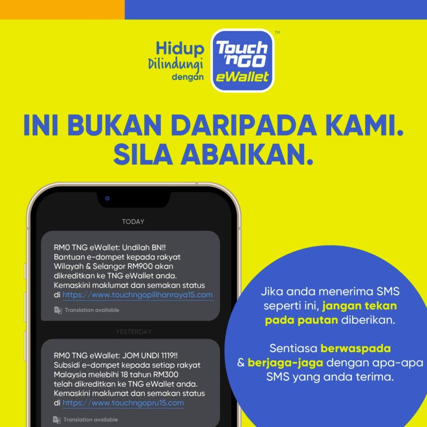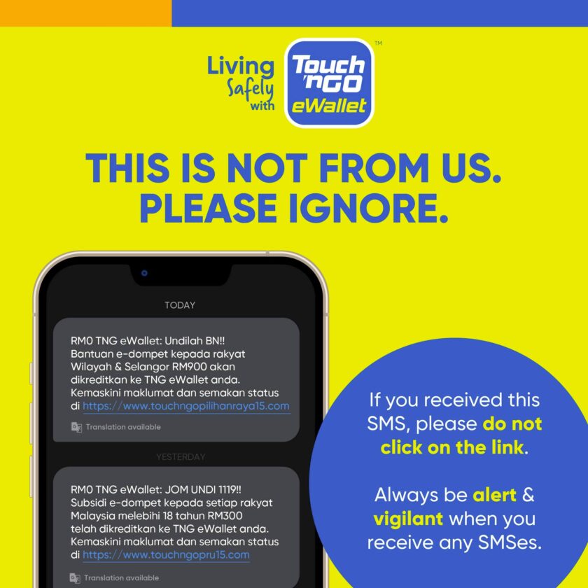 Touch ‘n Go eWallet在面子书官方专页发文宣布,如收到来自带有链接(Link)的SMS短信,千万别相信!因为TnG表示今日起将不会再发送带有链接的短信给用户,因此若用户收到声称来自该平台,带有链接的短信,请始终保持警惕和忽略,也别点击任何链接。