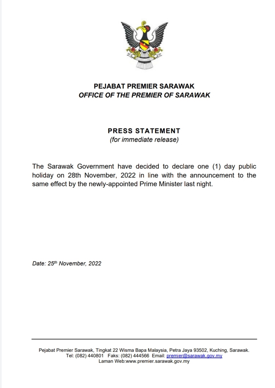 确定了 砂拉越11月28日星期一 也是公假 2022年11月25日2022年11月25日 L编 【#砂事】#砂拉越 #跟随联邦宣布 #11月28日 #公共假期 砂拉越总理办公室发布最新文告,砂拉越配合昨晚首相的宣布,也把11月28日星期一列为砂拉越公共假期。 📷照片Credit : Bernama #放假咯 #这个长周末要怎么过? Post Views: 154