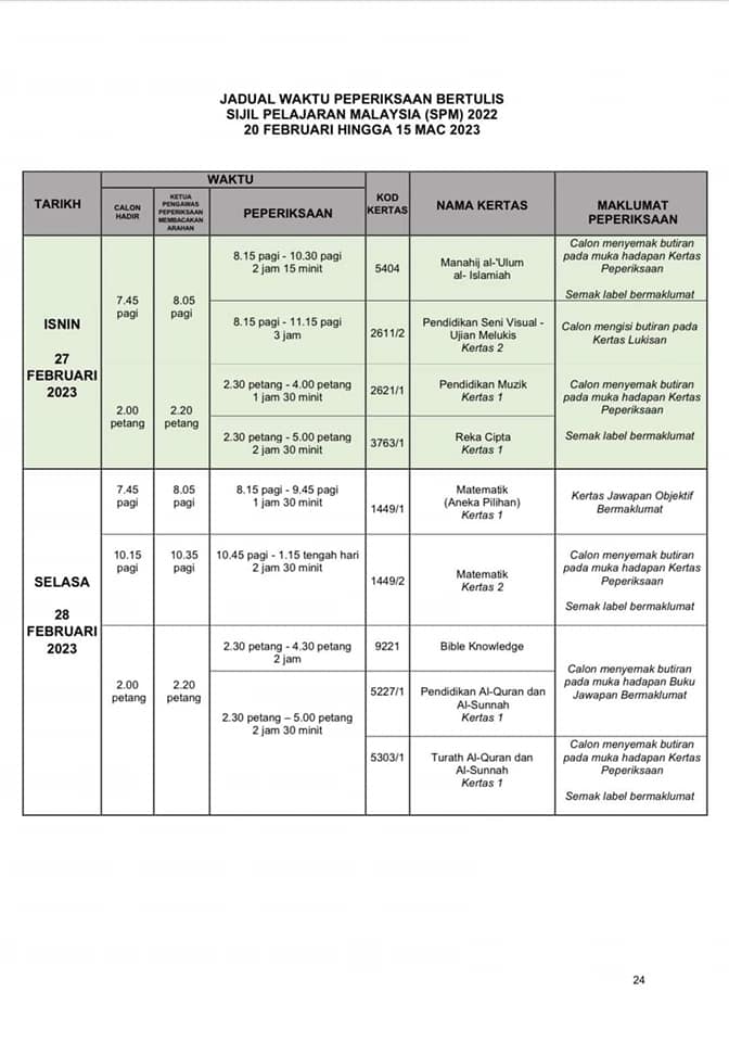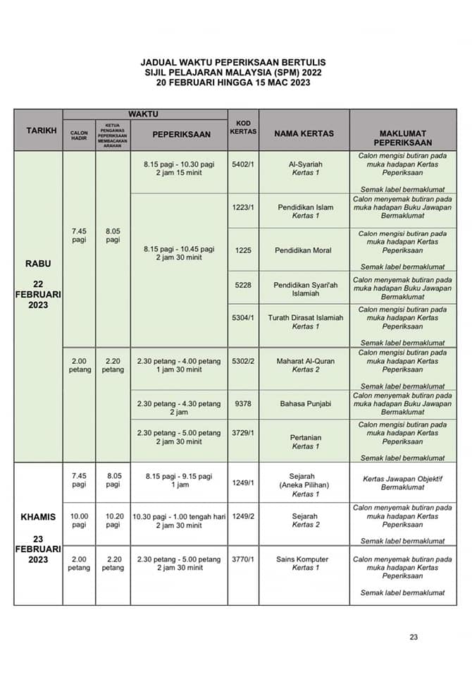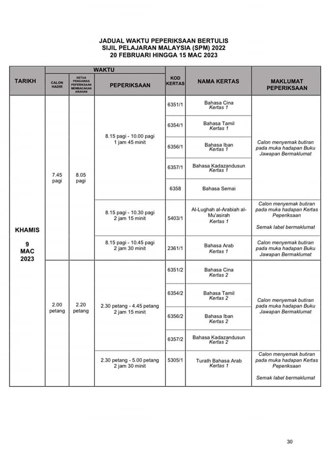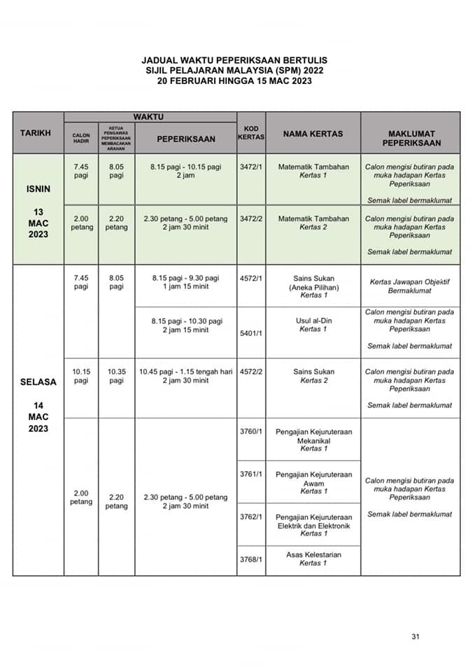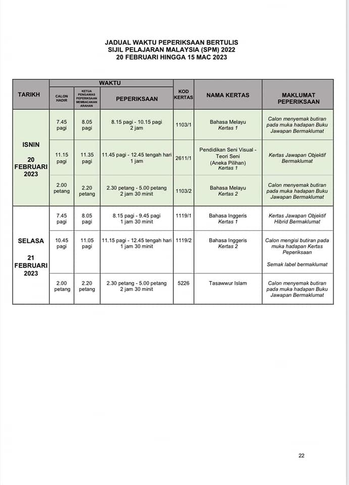SPM正式考试时间表出炉 2022年12月31日2022年12月31日 T编 【#大马事】 #SPM #考试 #时间表 #正式 #出炉 教育部发布了SPM考试时间表。SPM考生们你们准备好了吗? 小编在这边提醒大家,为了我们莘莘学子在考试期间路过学校记得不要喧哗也不要鸣笛。 Post Views: 213